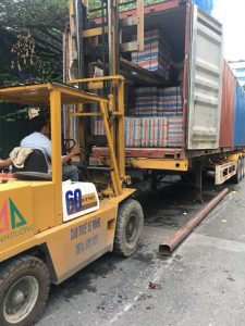 Sắp xếp lên pallet: Hàng sau khi rút ra được xếp ngay ngắn lên pallet, quấn màng co bảo vệ và di chuyển vào kho bằng xe nâng.